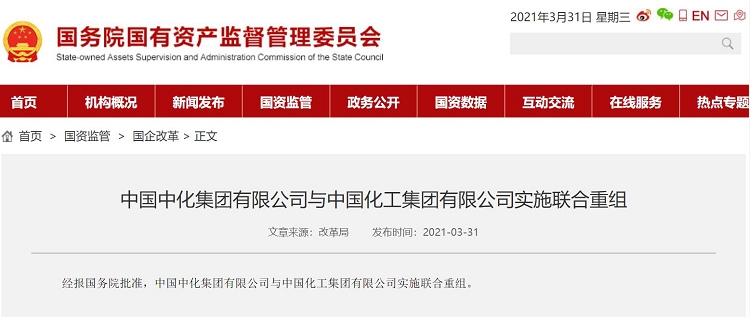 3月31日,經(jīng)國務(wù)院批準(zhǔn),中國中化集團(tuán)有限公司(以下簡稱“中化集團(tuán)”)與中國化工集團(tuán)有限公司(以下簡稱“中國化工”)實(shí)施聯(lián)合重組,新設(shè)由國務(wù)院國有資產(chǎn)監(jiān)督管理委員會代表國務(wù)院履行出資人職責(zé)的新公司,中化集團(tuán)和中國化工整體劃入新公司。此次聯(lián)合重組將更好地整合資源、發(fā)揮協(xié)同效應(yīng),打造世界一流的綜合性化工企業(yè),促進(jìn)我國化學(xué)工業(yè)高質(zhì)量發(fā)展。