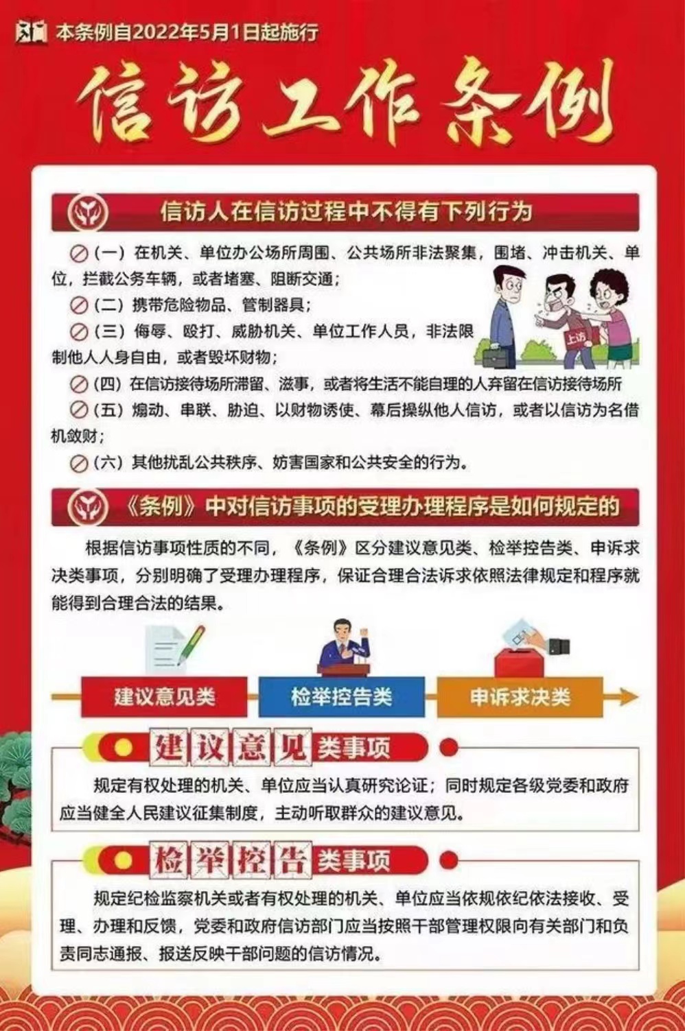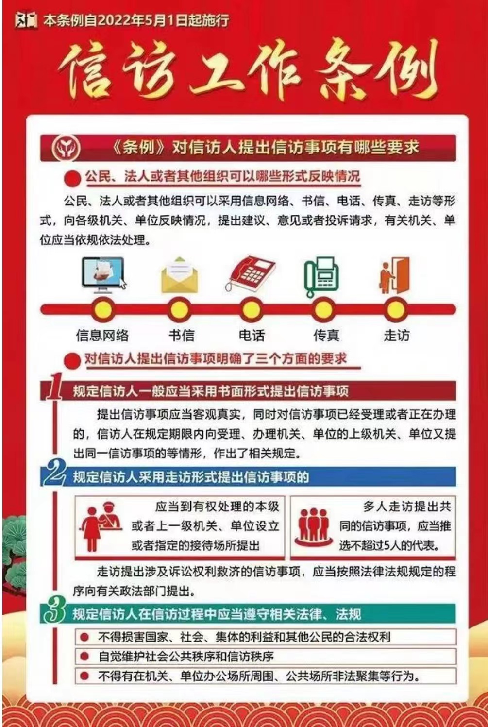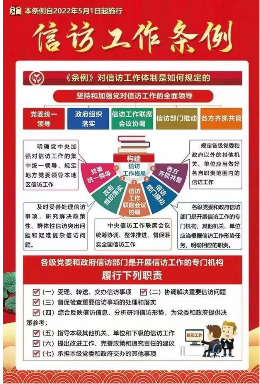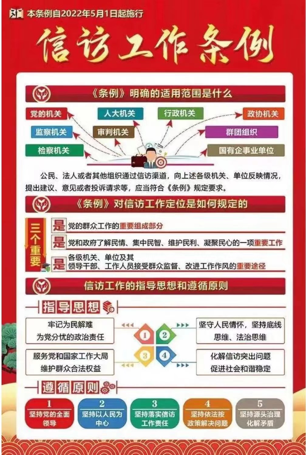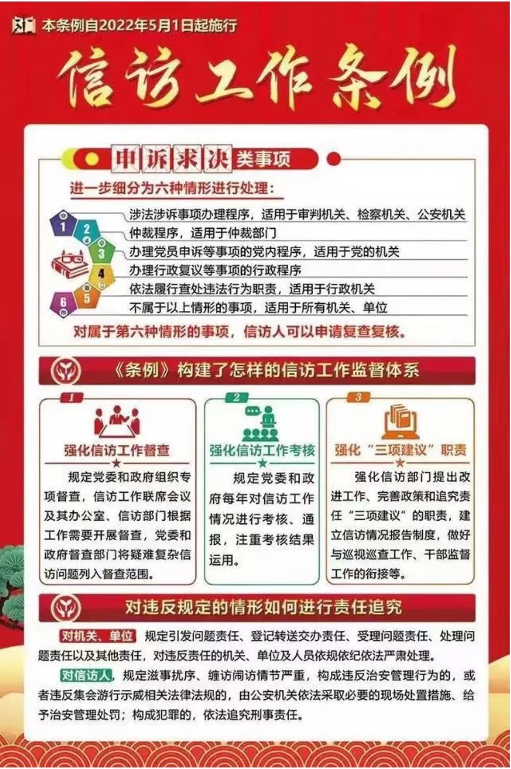 日前,中共中央、國務(wù)院印發(fā)的《信訪工作條例》(以下簡稱《條例》)全文公布,《條例》共650條,自今年51日起施行?!稐l例》詳盡規(guī)定了信訪工作的各環(huán)節(jié)事項(xiàng),以下亮點(diǎn)值得關(guān)注,一起來學(xué)習(xí)吧!